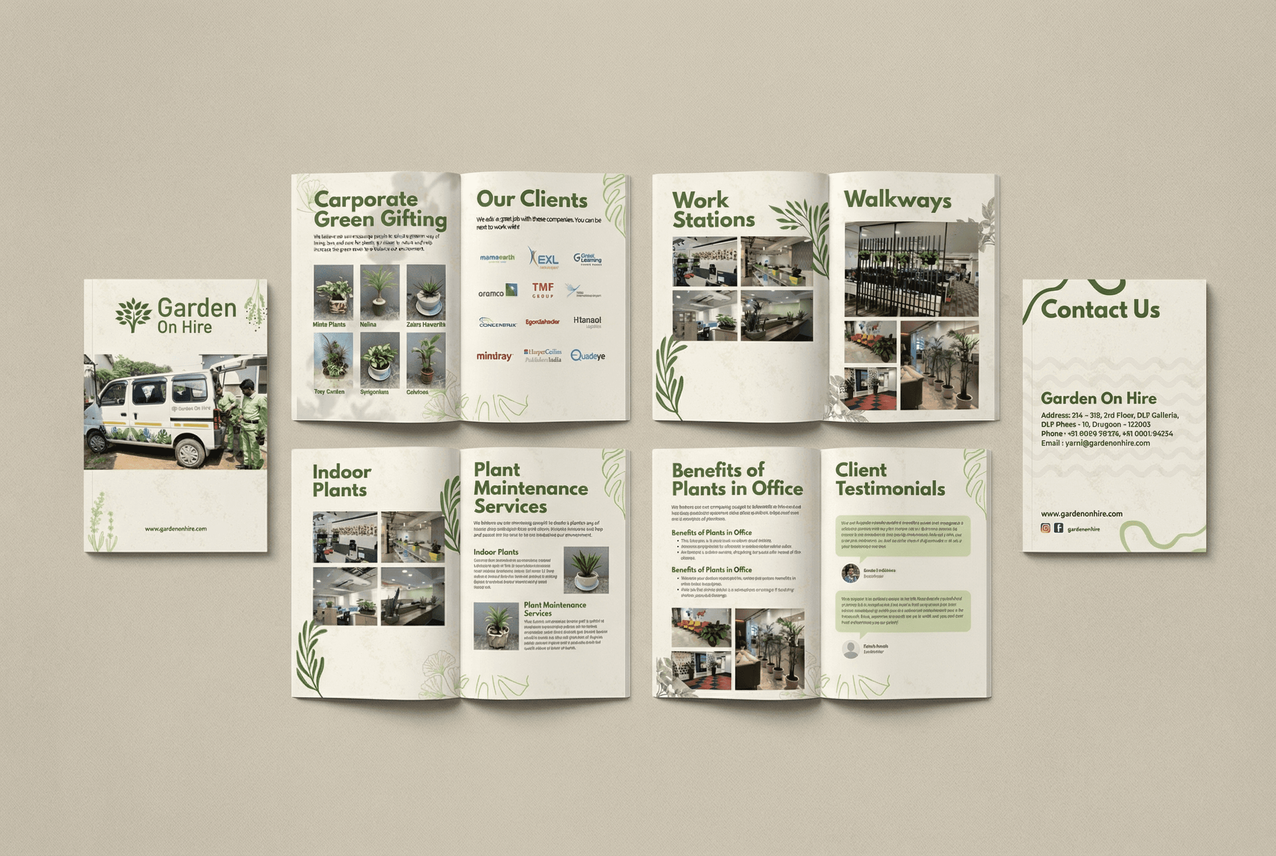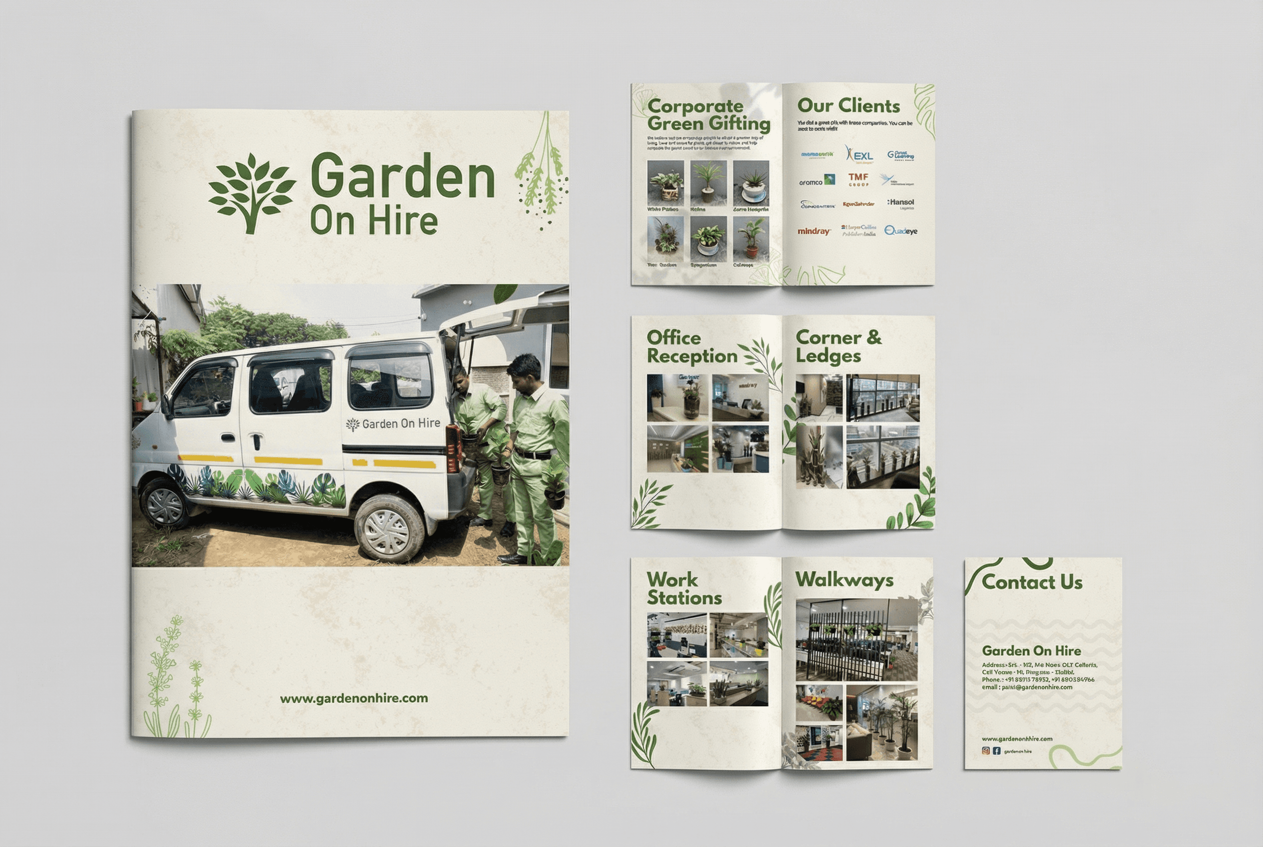 A logo and company profile brochure for Gurugram's industry leader in office plant design, installation, and maintenance. Collateral built to represent a brand that has greened the offices of Mamaearth, Aramco, Gartner, Mindray, HarperCollins, and the Noida International Airport.