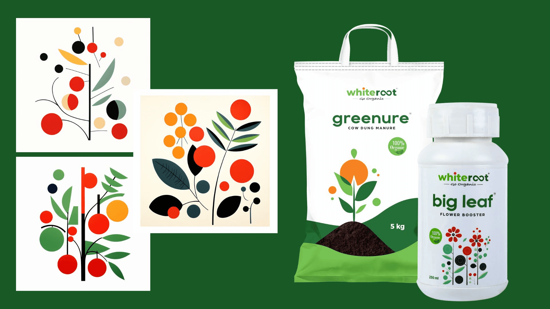 Packaging design across two product lines: Greenure Cow Dung Manure and Big Leaf Flower Booster. Botanical illustration system developed as a design language across both products. Shopify website design and build for the White Root Organics storefront.